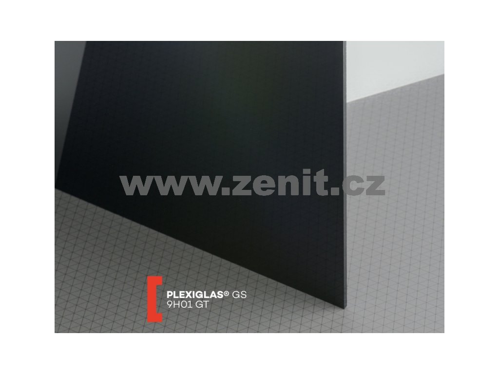 Lité černé plexisklo tl. 3 mm s označením 9H01 nepropouští žádné světlo. Jedná se o velmi kvalitní druh plexiskla, materiál je vysoce odolný proti UV záření a povětrnostním vlivům. Obě povrchové strany těchto desek z plexiskla jsou hladké a vysoce lesklé, dodávané s ochrannou folií. Široké použití v reklamě, stavebnictví a průmyslu. Výroba litím znamená, že materiál se naleje mezi dvě skleněné desky a v peci postupně chládne. Tímto získává menší vnitřní pnutí, avšak větší tloušťkovou toleranci než extrudované plexisklo.