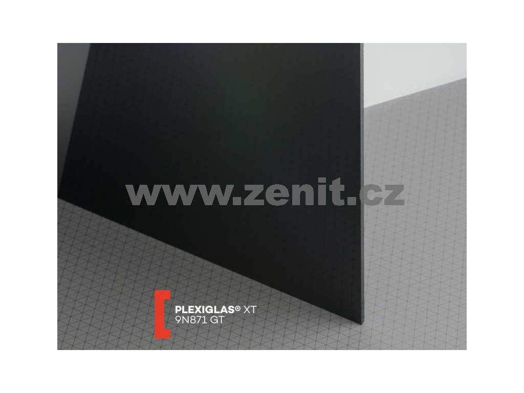 Extrudované černé plexi tl. 8 mm s označením 9N871 nepropouští žádné světlo. XT je základní a nejrozšířenější typ plexiskla - materiál je vysoce odolný proti UV záření a povětrnostním vlivům. Obě povrchové strany těchto desek z plexiskla jsou hladké a vysoce lesklé, dodávané s ochrannou folií. Široké použití v reklamě, stavebnictví a průmyslu. Výroba extruzí znamená, že desky jsou tzv. vytlačované mezi dvěma proti sobě rotujícími válci. Z tohoto důvodu má tento typ plexi větší vnitřní pnutí, než lité plexisklo. Má malou tloušťkovou toleranci.