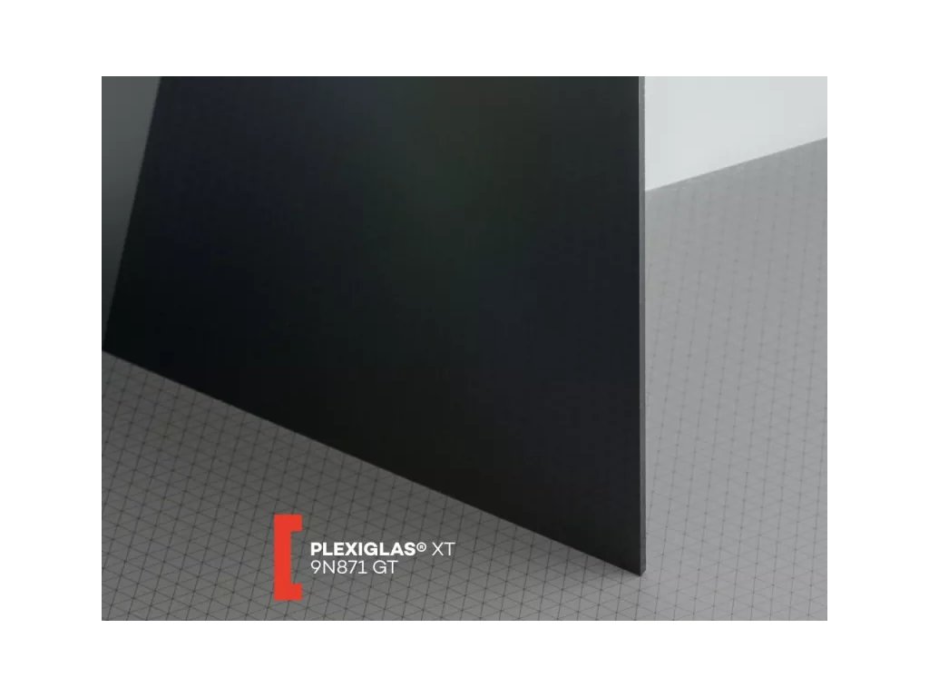 Extrudované černé plexi tl. 8 mm s označením 9N871 nepropouští žádné světlo. XT je základní a nejrozšířenější typ plexiskla - materiál je vysoce odolný proti UV záření a povětrnostním vlivům. Obě povrchové strany těchto desek z plexiskla jsou hladké a vysoce lesklé, dodávané s ochrannou folií. Široké použití v reklamě, stavebnictví a průmyslu. Výroba extruzí znamená, že desky jsou tzv. vytlačované mezi dvěma proti sobě rotujícími válci. Z tohoto důvodu má tento typ plexi větší vnitřní pnutí, než lité plexisklo. Má malou tloušťkovou toleranci.