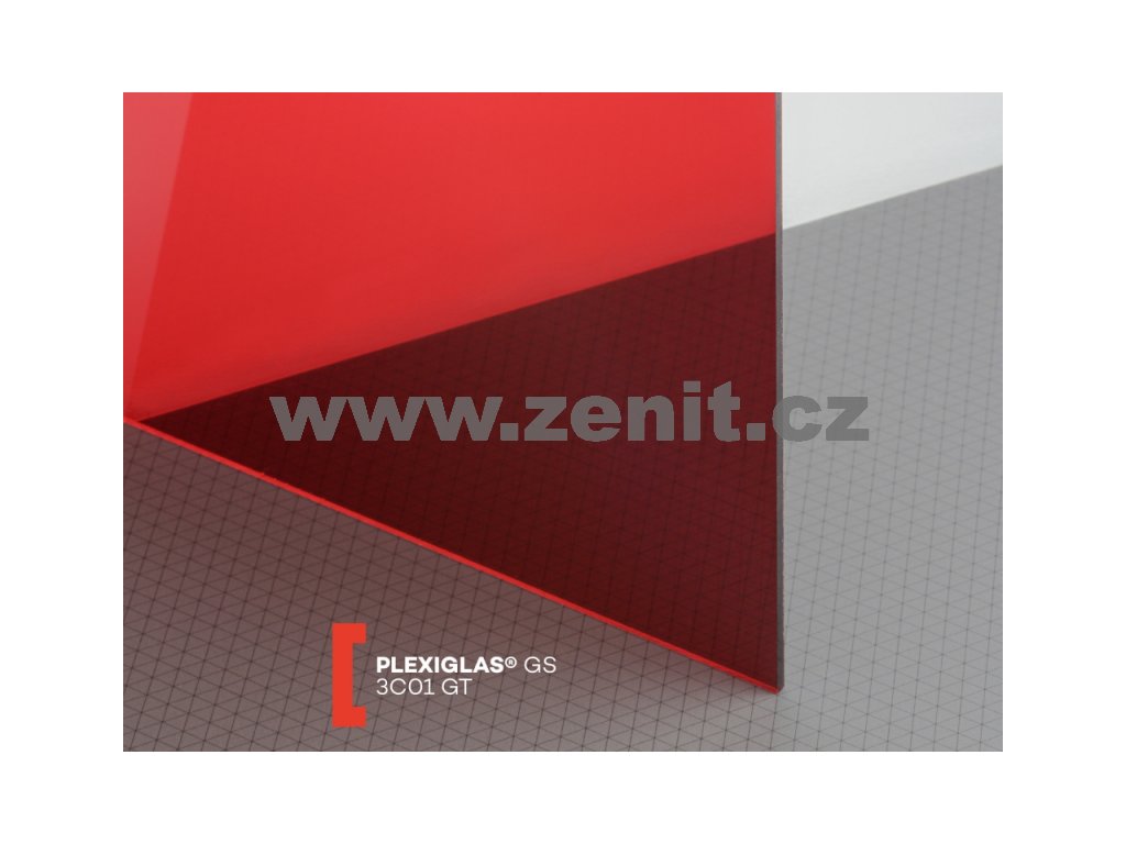 Barevné červené lité plexisklo tloušťky 3 mm Plexiglas GS 3C01 s propustností světla cca 4%. Jedná se o velmi kvalitní druh plexiskla, materiál je vysoce odolný proti UV záření a povětrnostním vlivům. Obě povrchové strany těchto desek z plexiskla jsou hladké a vysoce lesklé, dodávané s ochrannou folií. Široké použití v reklamě, stavebnictví a průmyslu. Výroba litím znamená, že materiál se naleje mezi dvě skleněné desky a v peci postupně chládne. Tímto získává menší vnitřní pnutí, avšak větší tloušťkovou toleranci než extrudované plexisklo.