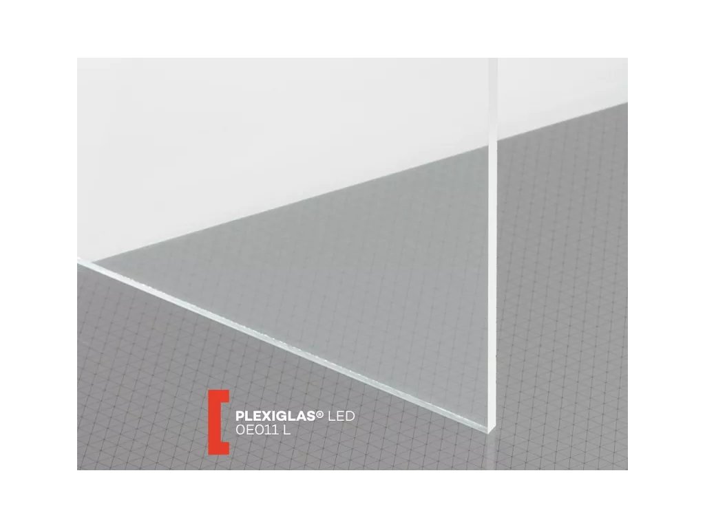 Plexiglas LED 0E011 typ L v tl. 6 mm pro nasvětlování LED diodami - dřívější označení EndLighten. Desky jsou speciálně vyvinuty především pro světelnou reklamu; materiál je vysoce odolný proti UV záření a povětrnostním vlivům. Poskytujeme 10-letou záruku a navíc 30-letou záruku na nežloutnutí na čiré desky. Obě povrchové strany těchto desek z plexiskla jsou hladké a vysoce lesklé, při dodávce jsou kryty silnou ochrannou folií. Široké použití v reklamě, nábytkářství či designu.
