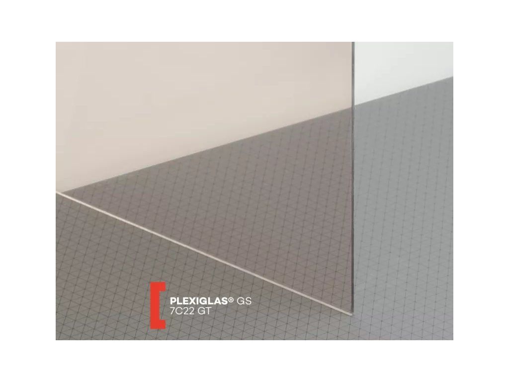 Lité kouřově hnědé barevné kouřové plexisklo tloušťky 8 mm Plexiglas GS 7C22 s propustností světla cca 56%. Jedná se o velmi kvalitní druh plexiskla, materiál je vysoce odolný proti UV záření a povětrnostním vlivům. Obě povrchové strany těchto desek z plexiskla jsou hladké a vysoce lesklé, dodávané s ochrannou folií. Široké použití v reklamě, stavebnictví a průmyslu. Výroba litím znamená, že materiál se naleje mezi dvě skleněné desky a v peci postupně chládne. Tímto získává menší vnitřní pnutí, avšak větší tloušťkovou toleranci než extrudované plexisklo.