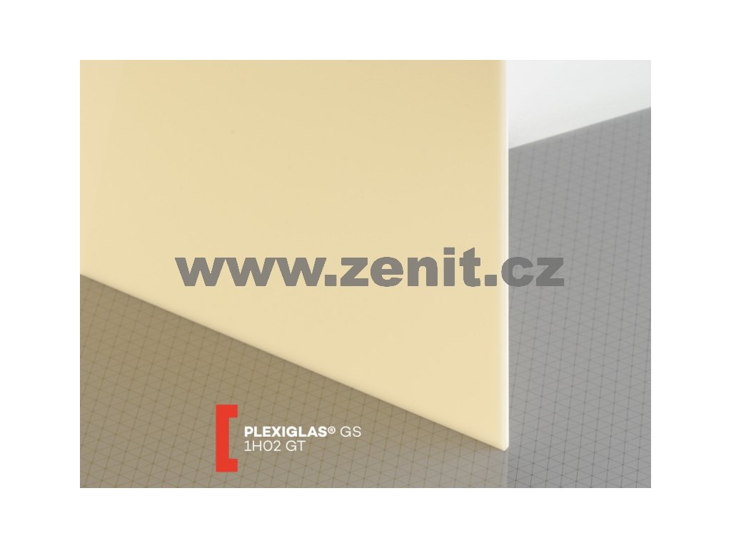 Lité krémové plexisklo tloušťky 3 mm Plexiglas GS 1H02 s propustností světla cca 27%. Jedná se o velmi kvalitní druh plexiskla, materiál je vysoce odolný proti UV záření a povětrnostním vlivům. Obě povrchové strany těchto desek z plexiskla jsou hladké a vysoce lesklé, dodávané s ochrannou folií. Široké použití v reklamě, stavebnictví a průmyslu. Výroba litím znamená, že materiál se naleje mezi dvě skleněné desky a v peci postupně chládne. Tímto získává menší vnitřní pnutí, avšak větší tloušťkovou toleranci než extrudované plexisklo.