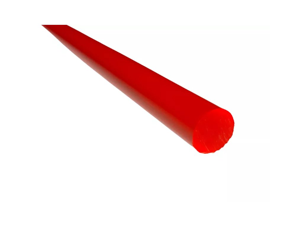 Fluorescentní tyč z plexiskla, délka 1,22 m. Kulaté tyče (kulatina), průměr 10 mm, způsob výroby extruzí (vytlačováním).