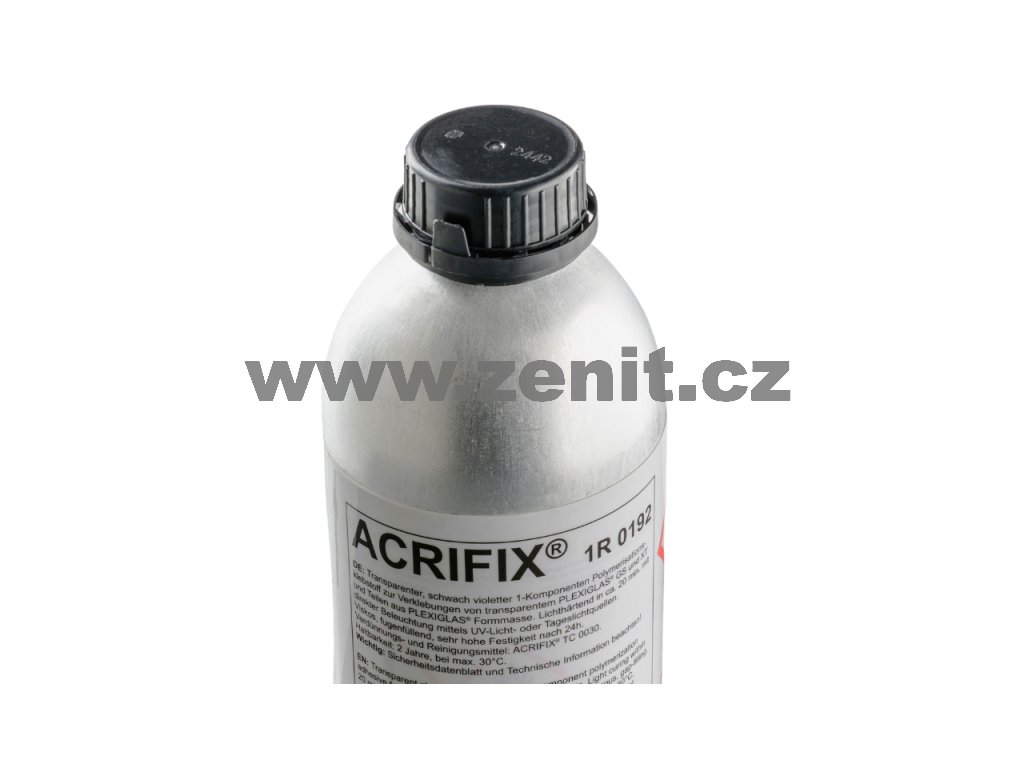 Lepidlo ACRIFIX® 1R 0192 je polymerové transparentní lepidlo s načervenalým odstínem, lepící roztok akrylátového polymeru v metakrylátu metylu, který je vytvrzován denním světlem. Druhou složkou tohoto lepidla je tedy světlo obsahující UV záření (zářivka, denní světlo). Určeno pouze pro čiré plexisklo!