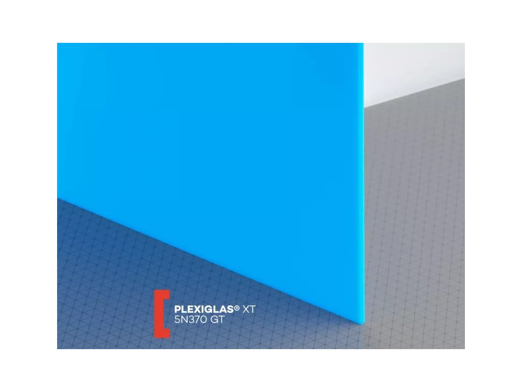 Barevné plexisklo modré barvy značky Plexiglas, označení barvy 5N370 tl. 3 mm s propustností světla cca 7%. Extrudovaný akrylát je základní a nejrozšířenější typ plexiskla. Materiál je vysoce odolný proti UV záření a povětrnostním vlivům, poskytujeme 10-letou záruku. Obě povrchové strany těchto desek z plexiskla jsou hladké a vysoce lesklé, dodávané s ochrannou folií. Široké použití v reklamě, stavebnictví a průmyslu. Výroba extruzí znamená, že desky jsou tzv. vytlačované mezi dvěma proti sobě rotujícími válci. Z tohoto důvodu má tento typ plexi větší vnitřní pnutí, než lité plexisklo Plexiglas GS. Má malou tloušťkovou toleranci.