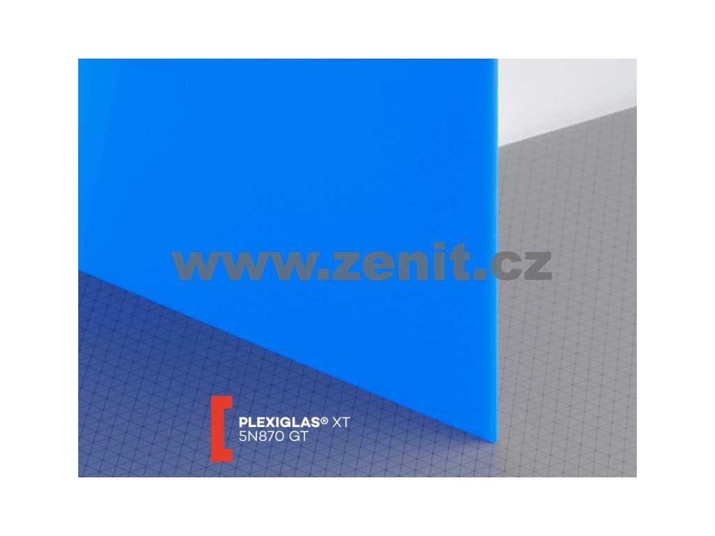 Akrylátové desky modré barvy, podobné RAL 5017, označení 5N870 tl. 3 mm s propustností svtětla cca 5%. XT je základní a nejrozšířenější typ plexiskla. Materiál je vysoce odolný proti UV záření a povětrnostním vlivům, poskytujeme 10-letou záruku. Obě povrchové strany těchto desek z plexiskla jsou hladké a vysoce lesklé, dodávané s ochrannou folií. Široké použití v reklamě, stavebnictví a průmyslu. Výroba extruzí znamená, že desky jsou tzv. vytlačované mezi dvěma proti sobě rotujícími válci. Z tohoto důvodu má tento typ plexi větší vnitřní pnutí, než lité plexisklo Plexiglas GS. Má malou tloušťkovou toleranci.