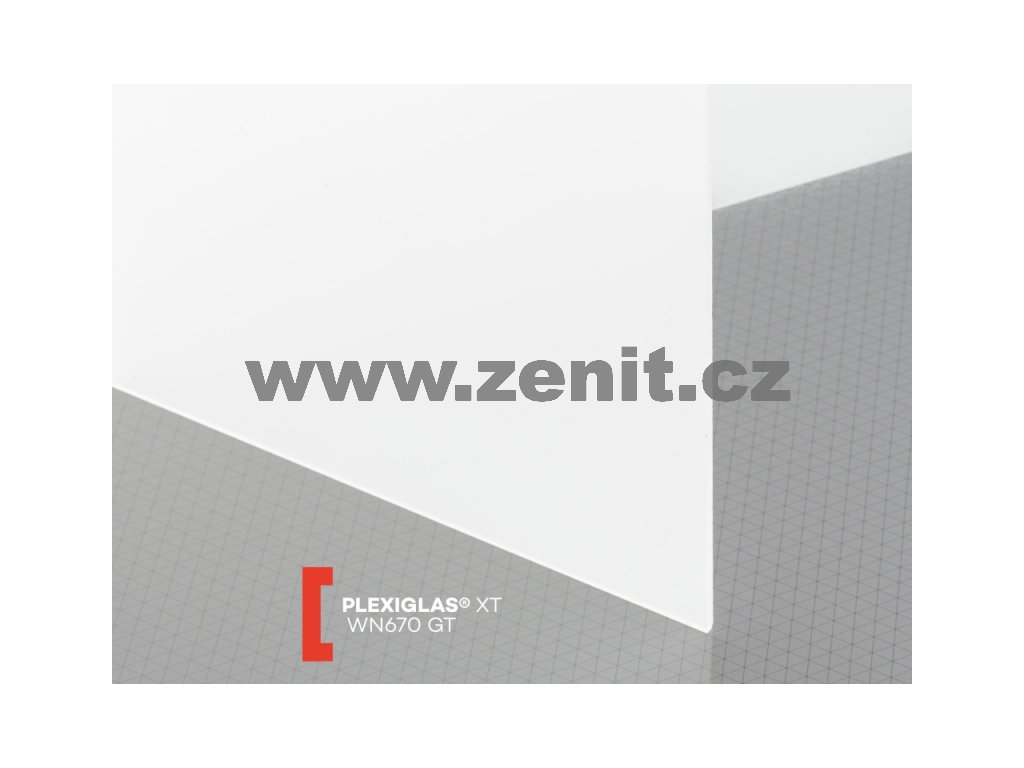 Opálově mléčné akrylátové desky Plexiglas WN670 s propustností světla cca 78% v tloušťce 4 mm. XT je základní a nejrozšířenější typ plexiskla. Materiál je vysoce odolný proti UV záření a povětrnostním vlivům. Obě povrchové strany těchto desek z plexiskla jsou hladké a vysoce lesklé, dodávané s ochrannou folií. Široké použití v reklamě, stavebnictví a průmyslu. Výroba extruzí znamená, že desky jsou tzv. vytlačované mezi dvěma proti sobě rotujícími válci. Z tohoto důvodu má tento typ plexi větší vnitřní pnutí, než lité plexisklo Plexiglas GS. Má malou tloušťkovou toleranci.
