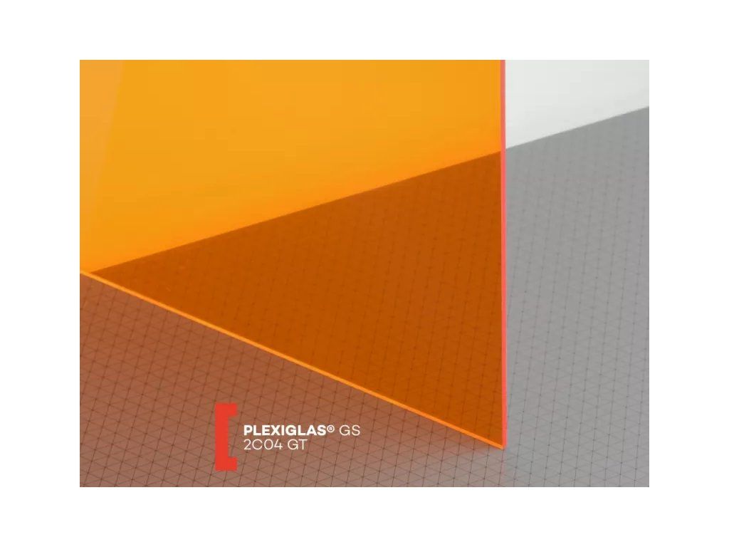 Lité průhledné oranžové plexisklo tloušťky 3 mm Plexiglas GS 2C04 s propustností světla cca 39%. Jedná se o velmi kvalitní druh plexiskla, materiál je vysoce odolný proti UV záření a povětrnostním vlivům. Obě povrchové strany těchto desek z plexiskla jsou hladké a vysoce lesklé, dodávané s ochrannou folií. Široké použití v reklamě, stavebnictví a průmyslu. Výroba litím znamená, že materiál se naleje mezi dvě skleněné desky a v peci postupně chládne. Tímto získává menší vnitřní pnutí, avšak větší tloušťkovou toleranci než extrudované plexisklo.