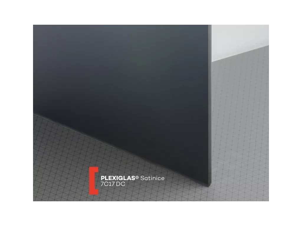 7C17 DC je karbonově tmavě šedé oboustranně pískované plexisklo značky Plexiglas SATINICE v tloušťce 6 mm s propustností světla cca 2%. Desky jsou určené mj. pro nasvětlení s optimálním rozptylem světla. Materiál je UV-nepropustný, vysoce odolný proti UV záření a povětrnostním vlivům, poskytujeme 10-letou záruku na stálost fyzikálních vlastností. Obě povrchové strany těchto desek z plexiskla jsou kryty ochrannou folií. Široké použití v reklamě, nábytkářství, designu... K tomuto typu desek dodáváme speciální lepidlo Acrifix 195, které po zaschnutí není lesklé, ale vytváří dojem opískování.