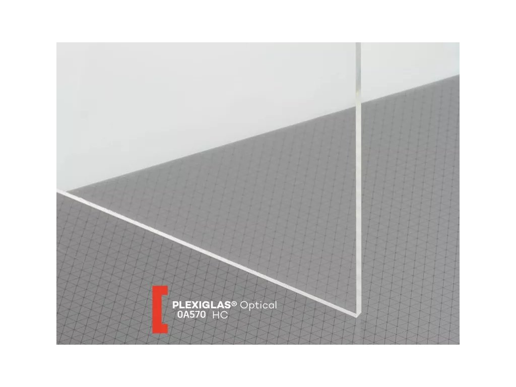 PLEXIGLAS Optical jsou akrylátové PMMA desky tloušťky 3 mm s vrchní stranou opatřenou tvrzeným povrchem (pouze z jedné strany - při dodání kryta červenou folií).