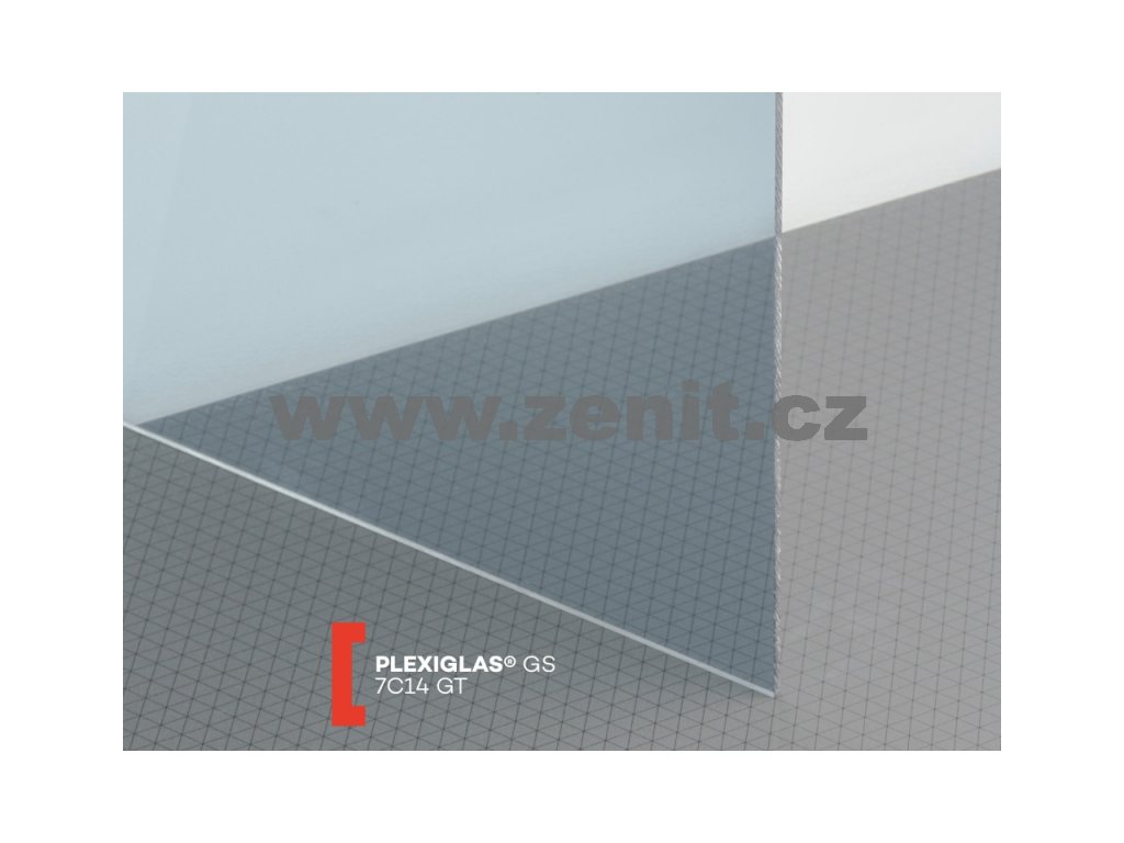 Průhledné šedé kouřové lité plexisklo tloušťky 3 mm Plexiglas GS 7C14 s propustností světla cca 49%. Jedná se o velmi kvalitní druh plexiskla, materiál je vysoce odolný proti UV záření a povětrnostním vlivům. Obě povrchové strany těchto desek z plexiskla jsou hladké a vysoce lesklé, dodávané s ochrannou folií. Široké použití v reklamě, stavebnictví a průmyslu. Výroba litím znamená, že materiál se naleje mezi dvě skleněné desky a v peci postupně chládne. Tímto získává menší vnitřní pnutí, avšak větší tloušťkovou toleranci než extrudované plexisklo.