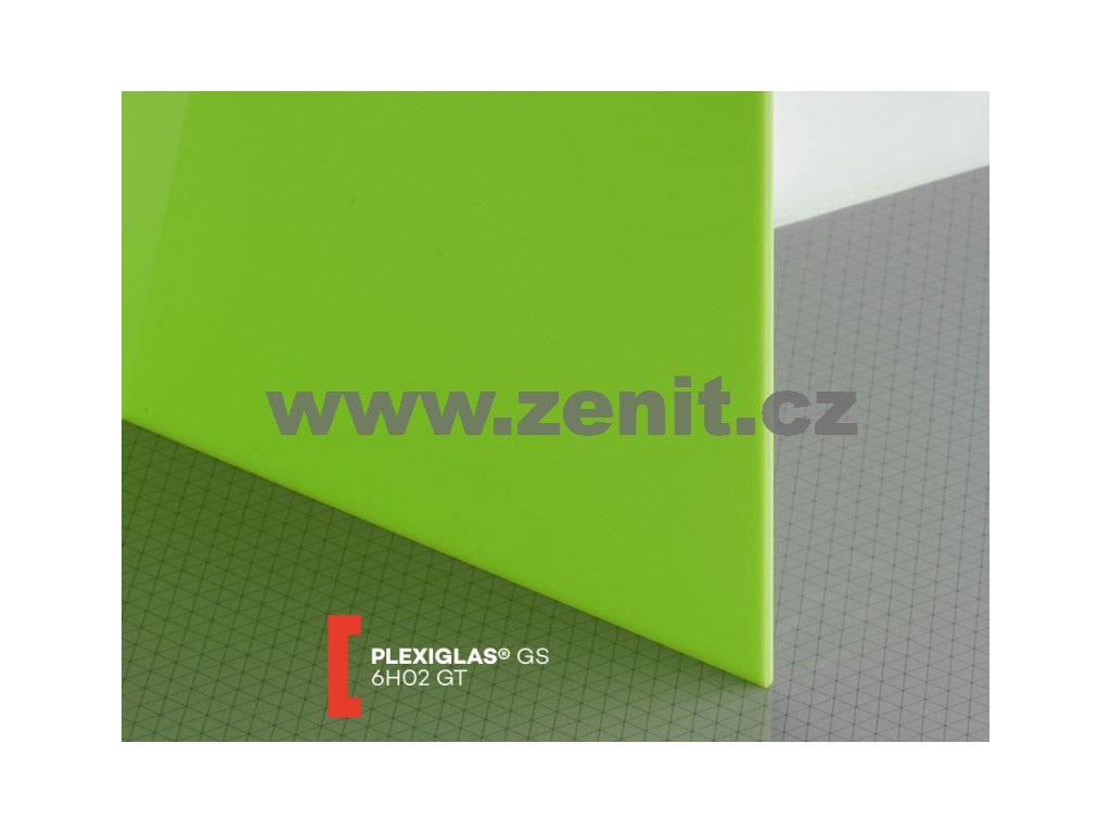 Hráškově zelené lité průsvitné plexisklo tloušťky 3 mm Plexiglas GS 6H02 s propustností světla cca 12%. Jedná se o velmi kvalitní druh plexiskla, materiál je vysoce odolný proti UV záření a povětrnostním vlivům. Obě povrchové strany těchto desek z plexiskla jsou hladké a vysoce lesklé, dodávané s ochrannou folií. Široké použití v reklamě, stavebnictví a průmyslu. Výroba litím znamená, že materiál se naleje mezi dvě skleněné desky a v peci postupně chládne. Tímto získává menší vnitřní pnutí, avšak větší tloušťkovou toleranci než extrudované plexisklo.