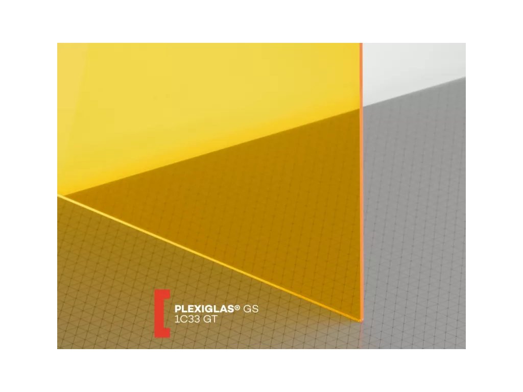 Lité průhledné žluté plexisklo tloušťky 3 mm Plexiglas GS 1C33 s propustností světla cca 63%. Jedná se o velmi kvalitní druh plexiskla, materiál je vysoce odolný proti UV záření a povětrnostním vlivům. Obě povrchové strany těchto desek z plexiskla jsou hladké a vysoce lesklé, dodávané s ochrannou folií. Široké použití v reklamě, stavebnictví a průmyslu. Výroba litím znamená, že materiál se naleje mezi dvě skleněné desky a v peci postupně chládne. Tímto získává menší vnitřní pnutí, avšak větší tloušťkovou toleranci než extrudované plexisklo.